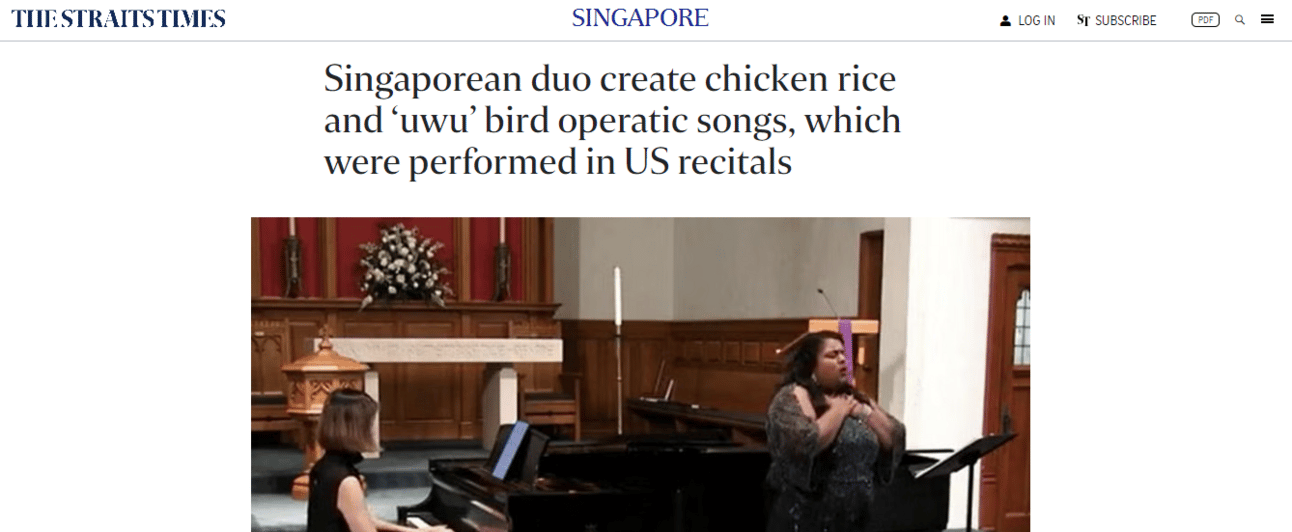 We commissioned a song set in Singlish (English spoken by modern Singaporeans) to Nicholas Ho (‘23, CCM). A video clip of the song set, Singbites, has gone viral among young Singaporeans and earned more than 250K views! Major Singapore media outlets, such as The Strait Times, TODAY, Mothership, Tamil Murasu, wrote about the song set, which described the taste, smell, and scenery of Singapore. Glow Music is proud to make an impact on the cultural scene of Singapore and a meaningful contribution to the body of Asian art songs.