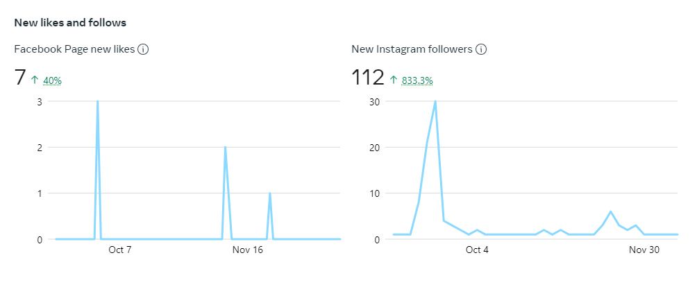 Facebook new likes and follows: 7 (40% higher), Instagram: 112 (833% higher)
