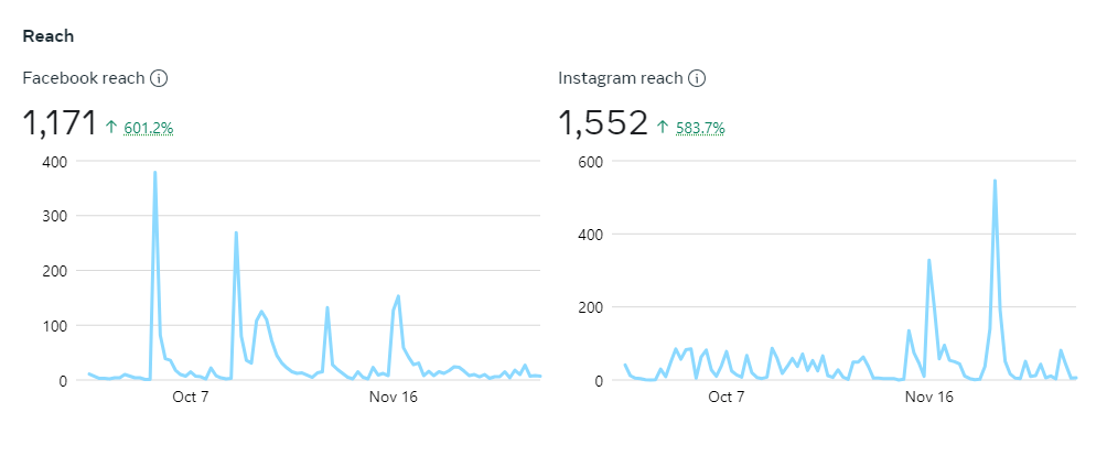 Facebook reach: 1,171 (601.2% higher), Instagram reach: 1,552 (583.7% higher)