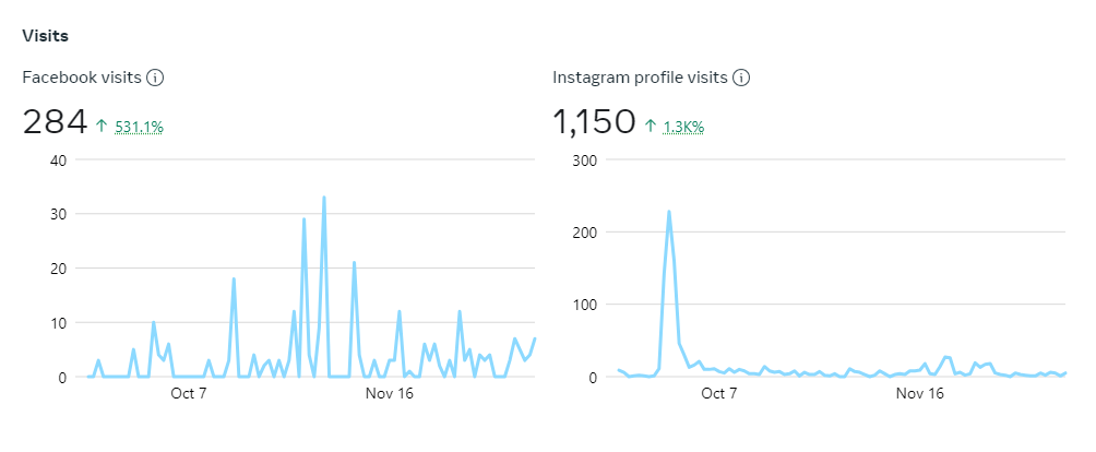 Facebook visits: 284 (531.1% higher), Instagram profile visits: 1,150 (1300% higher)
